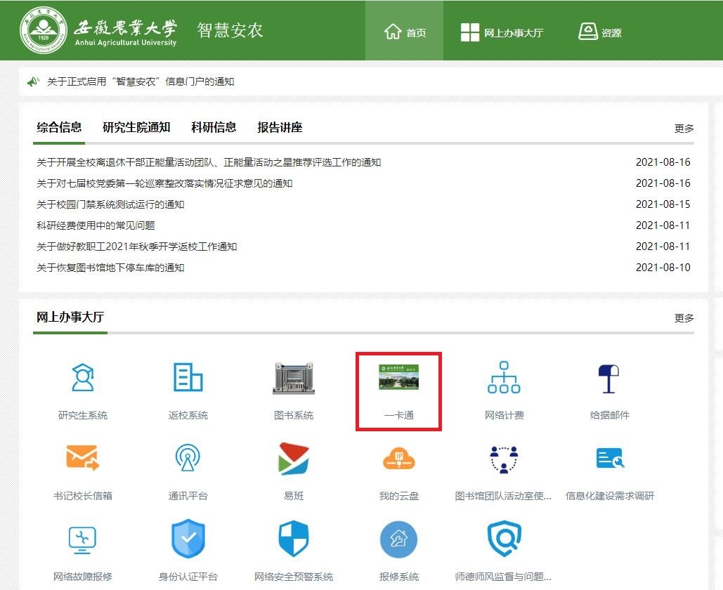 1.访问安徽农业大学主页(http://www.ahau.edu.cn),点击“智慧安农”;