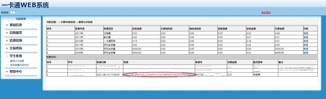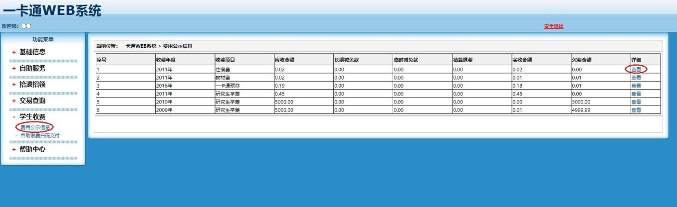 4.在打开的一卡通WEB系统页面中,依次点击功能菜单下的“学生收费”、“费用公示信息”。在出现的费用公示信息页面,再点击需要查看的收费项目详细栏内的“查看”;