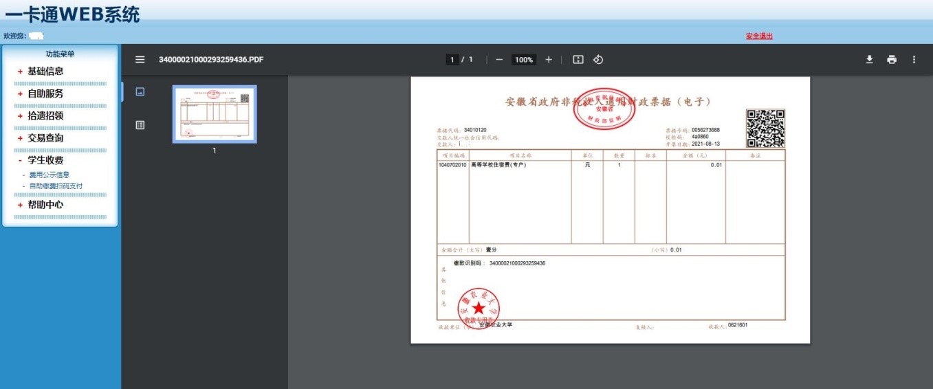 6.显示缴费电子发票(图示为Chrome浏览器显示效果,其他浏览器显示页面基本相同),此时可以保存、打印电子发票。